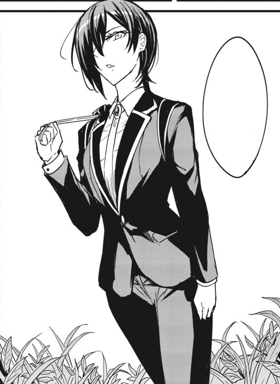 Examiner has dark bob-length hair with bangs that cover the right side of her face and her injured right eye. Unlike other female guild employees, she wears the male uniform of a dark suit over a white shirt and tie, and a pair of dark pants and shoes.