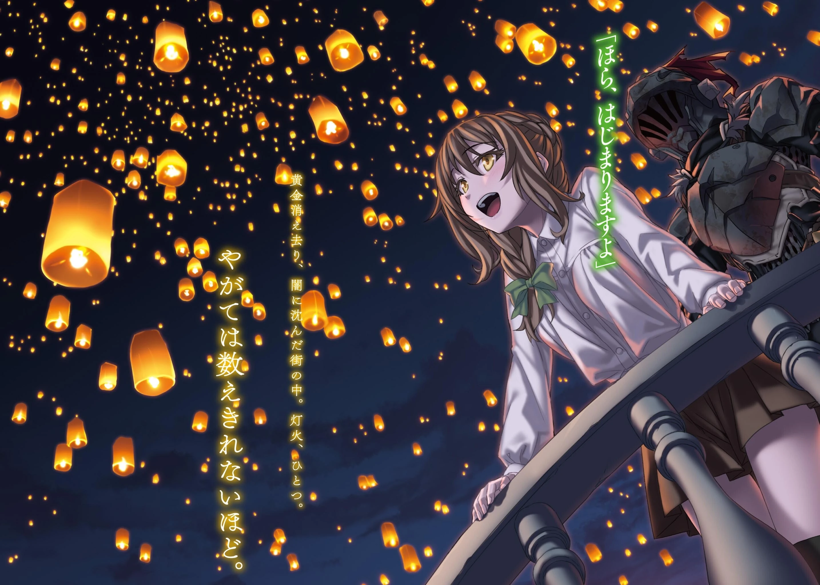 A few days before the Harvest Festival, Guild Girl worked up the courage to ask Goblin Slayer to go on a date with her. On the date, she took Goblin Slayer to a watchtower, where they observed lit lanterns floating toward the sky and Priestess performing a god calling prayer. While watching, Guild Girl, remembering that Goblin Slayer's actions enabled this moment to happen, felt some degree of guilt for jumping at the chance to ask him out before the festival and wondered if he was truly capable of seeing and understanding someone other than Goblins.