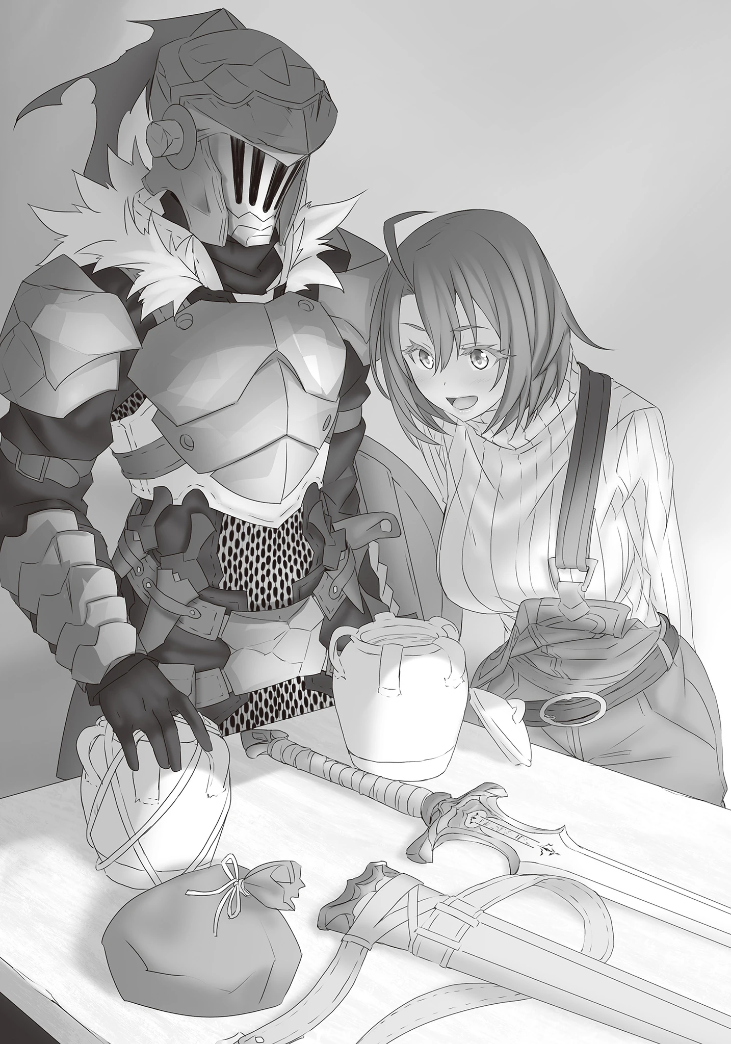 Inside, Goblin Slayer tells her all about the trek across the mountain, battling the Goblins or "Orcs" in the Dwarven Fortress, the Vikings, battling Goblins at sea, battling the Sea-Devil, and finally how Priestess was being considered for a promotion. As he tells her the story in his usual short bursts, Cow Girl notices the beautiful short length sword, the Seax from earlier, that Goblin Slayer brought back. Goblin Slayer explains he had the sheath made for it, polished it up, and brought it home as a decoration which Cow Girl suggest he display it in his shed.